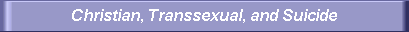 8. THE DAY YOU REACH FOR THE GUN OR THE POISON, STOP LOOKING FOR THE MAGIC CURE. Being mistreated by those that assume medical and psychological expertise should make you feel hurt -- not worthless. Not finding the magic cure should cause a grieving cycle -- not a suicidal drive. Realizing that you were duped by some “good man” selling snake oil should make you angry at him and yourself -- but not give you enough hate to want to put your own gun to your own head. If you want to ‘check out’ of life with a bottle of pills, call your counselor immediately or a friend immediately that is supportive of your GID. Then, consider going out with your friend to coffee, watching a video of a comedian, or doing anything that will stop the downward spiral. Most crises pass within days. Likewise, if you sense a downward spiral in someone else, then they are wounded. And the wounded ain’t pretty. But don’t walk on the other side, and leave them there to die; instead, listen, listen, and listen to them. Change your calendar for one hour, and save a life. Sadly, do not encourage the wounded to contact a pastor, priest, or vicar unless you know absolutely that they can work with the emotionally torn. Jesus said, “A certain man was left for dead. A priest came by, and walked on the other side. A Levite (religious leader) came by, and walked on the other side.” [Luke 10] Avoidance of the wounded, especially the GID wounded (commonly called transsexuals), is the norm for most religious leaders. Be certain your religious leader is flexible enough to have his/her compassion overcome his/her repulsion. We don’t need you, or anyone else, dead.